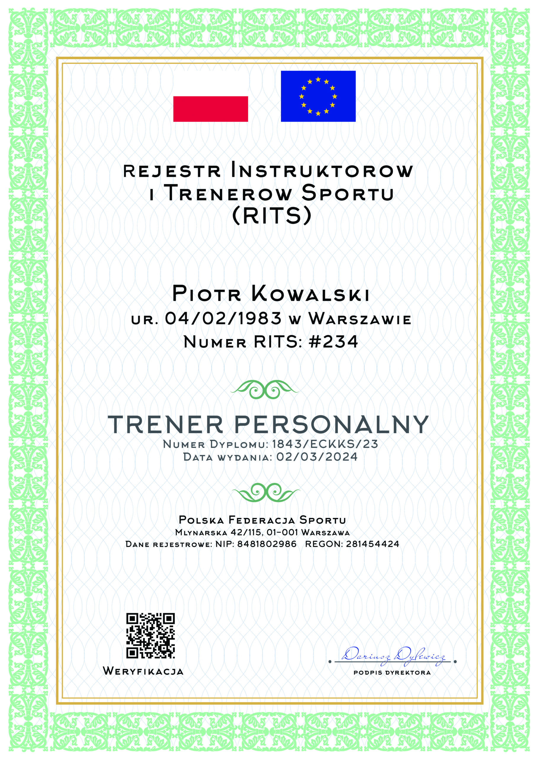 Każdy instruktor lub trener sportu po wykupieniu dodatkowej opcji i dokonaniu wpisu do Rejestru Instruktorów i Trenerów Sportu (RITS) otrzymuje e-certyfikat, który może mieć zawsze przy sobie, np. w pamięci swojego telefonu lub może go wydrukować do innych celów. Każdy e-certyfikat zawiera unikalny QR Code, który po zeskanowaniu prowadzi do profilu Online na naszej stronie internetowej, gdzie Pracodawca lub Klient może zweryfikować uprawnienia danego instruktora lub trenera.